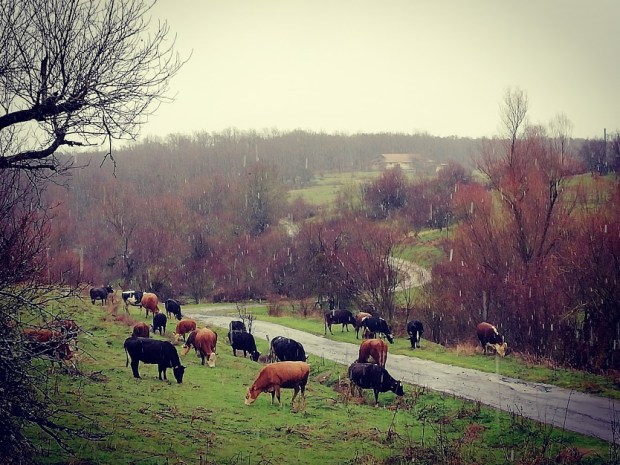 По едно време стадо кравички- едни такива червени и рошави, минаха по пътя с бавна стъпка , блажено си пасяха от сочната тревчика и въобще, не бяха притеснени, че се мокрят,заснежават или там някакви други дискомфорти.