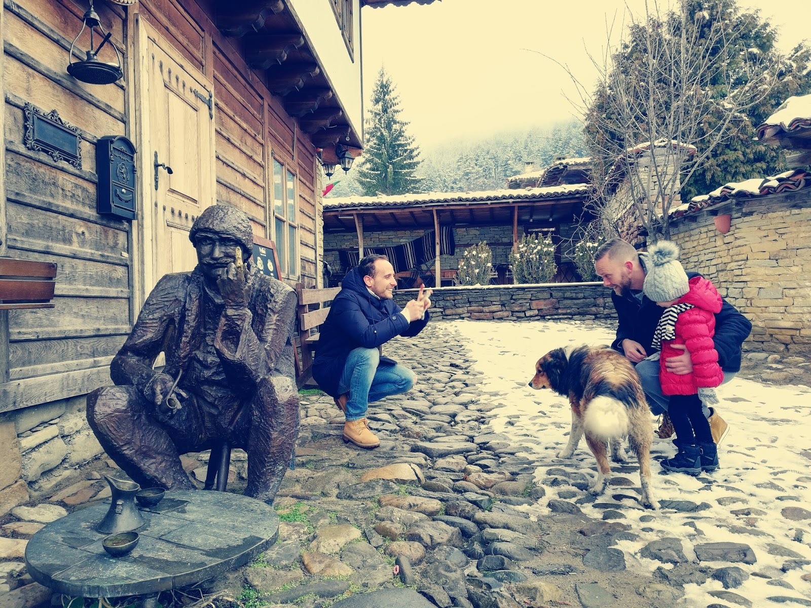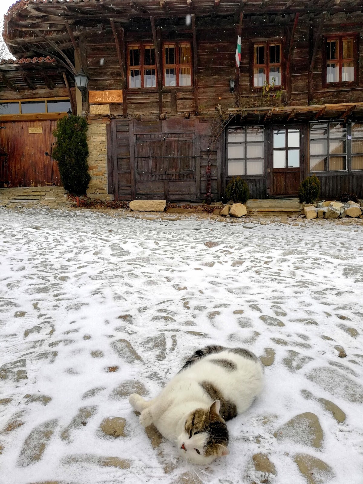 Влязохме, вътре приглушено се ситнеше хорце,насреща ни, камина с пукащи дръвца и шарени миндерчета, които обещаващо подканваха да се отпуснем , да сложим лакти на масата и да мечтаем за вкусна храна ..естествено, ако в такава кръчмичка не люснеш боб и греяна ракия, би било грях,затова си го спестихме …много ядохме и много пихме, Роската и Матео зажадняли за бг храна и ракия поръчваха като за циганска сватба..след броени часове си тръгнахме , търкаляйки се обратно към къщичката, в която бяхме отседнали…