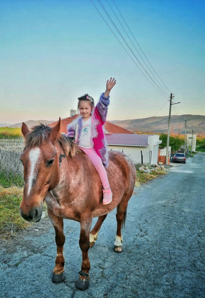 Вивата нали и тя си пада много по коне и понита и от миналата година беше хвърлила око на коня на сина на съседа …който е кафяв с дълга руса грива и опашка, добре охранен. Но той минава само впрегнат в каруцата и живеят далеч от нас…Един ден татко отиде да попита,“чичо ТИ“ Иван, дали не може да се качи на неговия кон…. Онзи, който по цял ден пасе срещу нашия двор с камбанката на вратлето и похлопва денонощно.