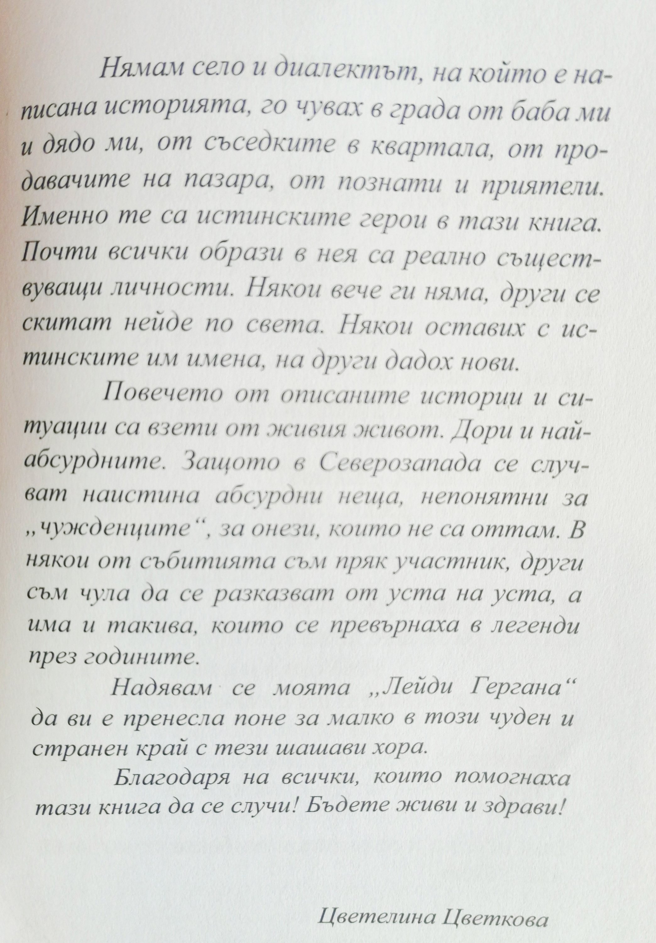 Тези дни карантинни, студени, ме забучват в книгите…. Толкова е свинско през този Март, че няма и накъде! Студ, вятър, дъжд и от време на време сняг за разнообразие. Никакви срещи, още повече… никакви пътешествия.. Отрязаха ни емоциите! Човек има нужда от комедия и БАМ насреща ми изкача книгата на Цветелина Цветкова…Божке, тя носи моето име, че и съвпад и аз съм живяла в Северозапада😂😂😂😂 Първо попаднах в нета на откъс от книгата й … После поред на номерата изтичах до Хеликон да се заредя с нея… И падам хора… Падам от смях…!!!! Само във втора страница, героинята Гергана от Видин, ме трепе с изречението:“Поизраснах така едра и убава. От мама зех гъстата коса, от тате-мустака!“