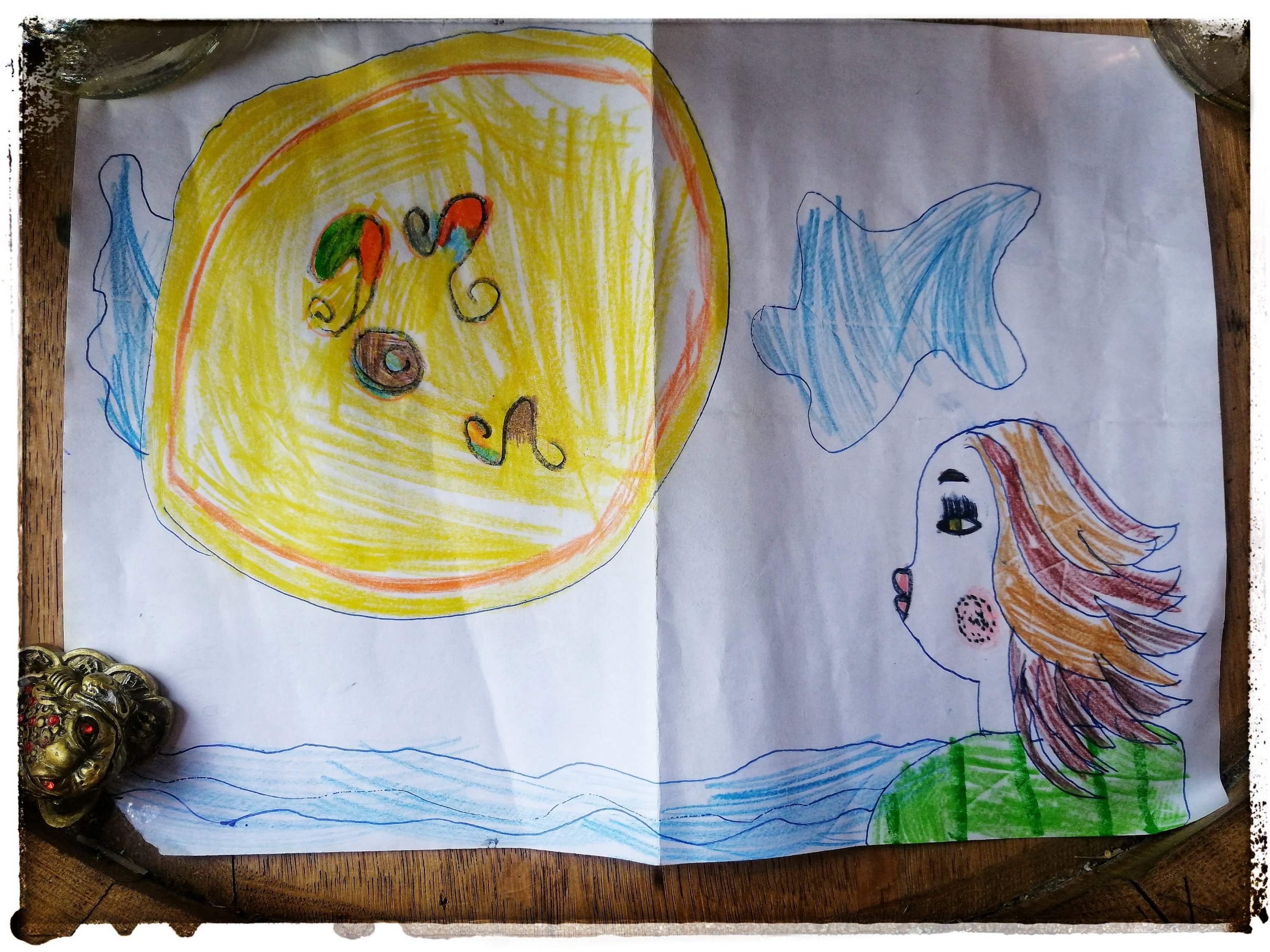 И влизаме…аз съм разтворила папируса и се разпознавам на него, но за всеки случай питам автора, демек Вивата какво виждат очите ми …И тя ми разказва с най-голямата си усмивка… Мамо, това си ти и си на морето,гледаш го ето така: присвива очи и издава въздишка…Каква красотаааа! -имитира ме. После гледаш към Слънцето …Да Виве Слънцето е много голямо, маме…Ами много е голямоо ,защото му се радваш и на него! А какви са тези работи в Слънцето? … Не, не те не са в Слънцето, това са ангелите на радосттааааа! На кой са тези ангели , маменце?..Ами твоите! Ти ги гледаш и те са над теб! Аз млъкнах, щото се разплаках..викам си каква сензитивност у това дете, обичам я!