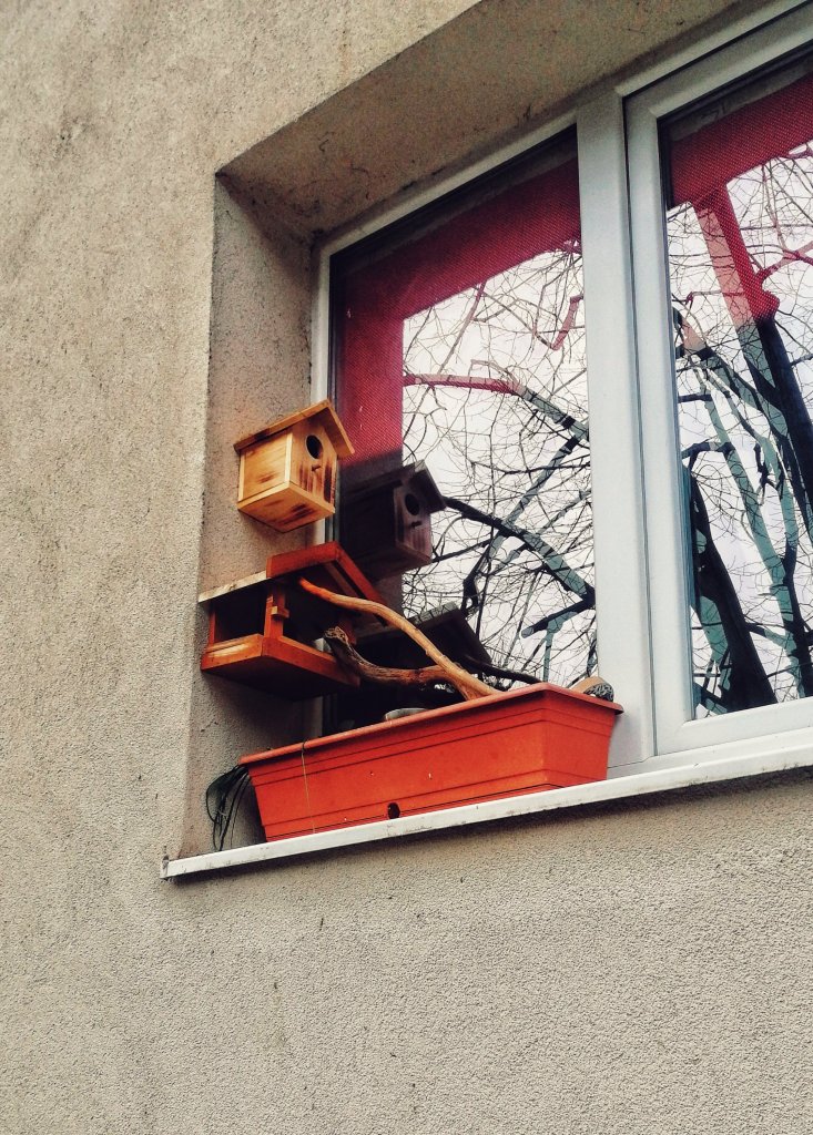 Излизайки от входа видях, на прозореца на съседите от първият етаж, как грижливо са аранжирали саксия, къщички и клони да поканят птиците да чуруликат под прозореца им. Викам си – какъв первазен романс се вихри тук из таз околна сивота.