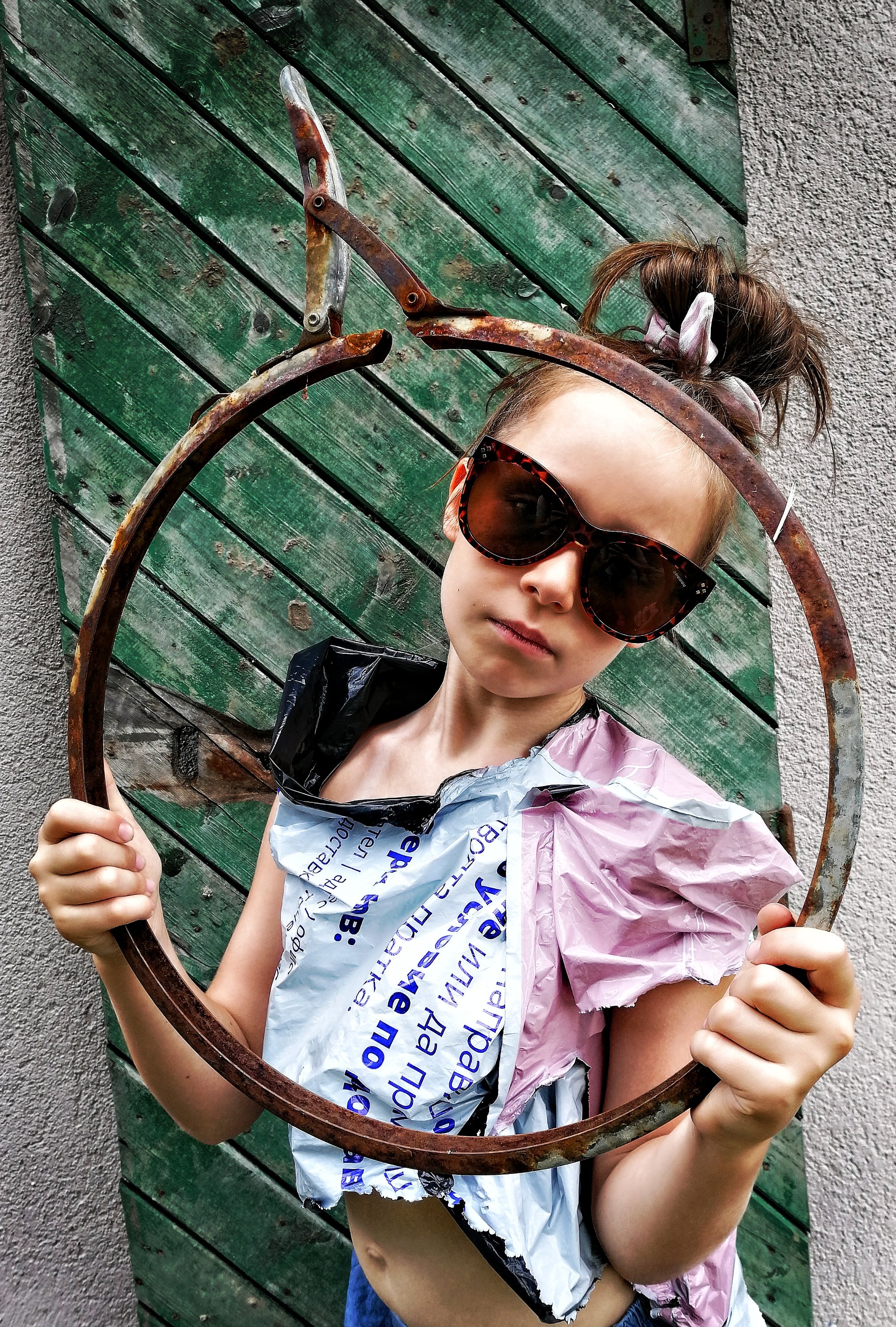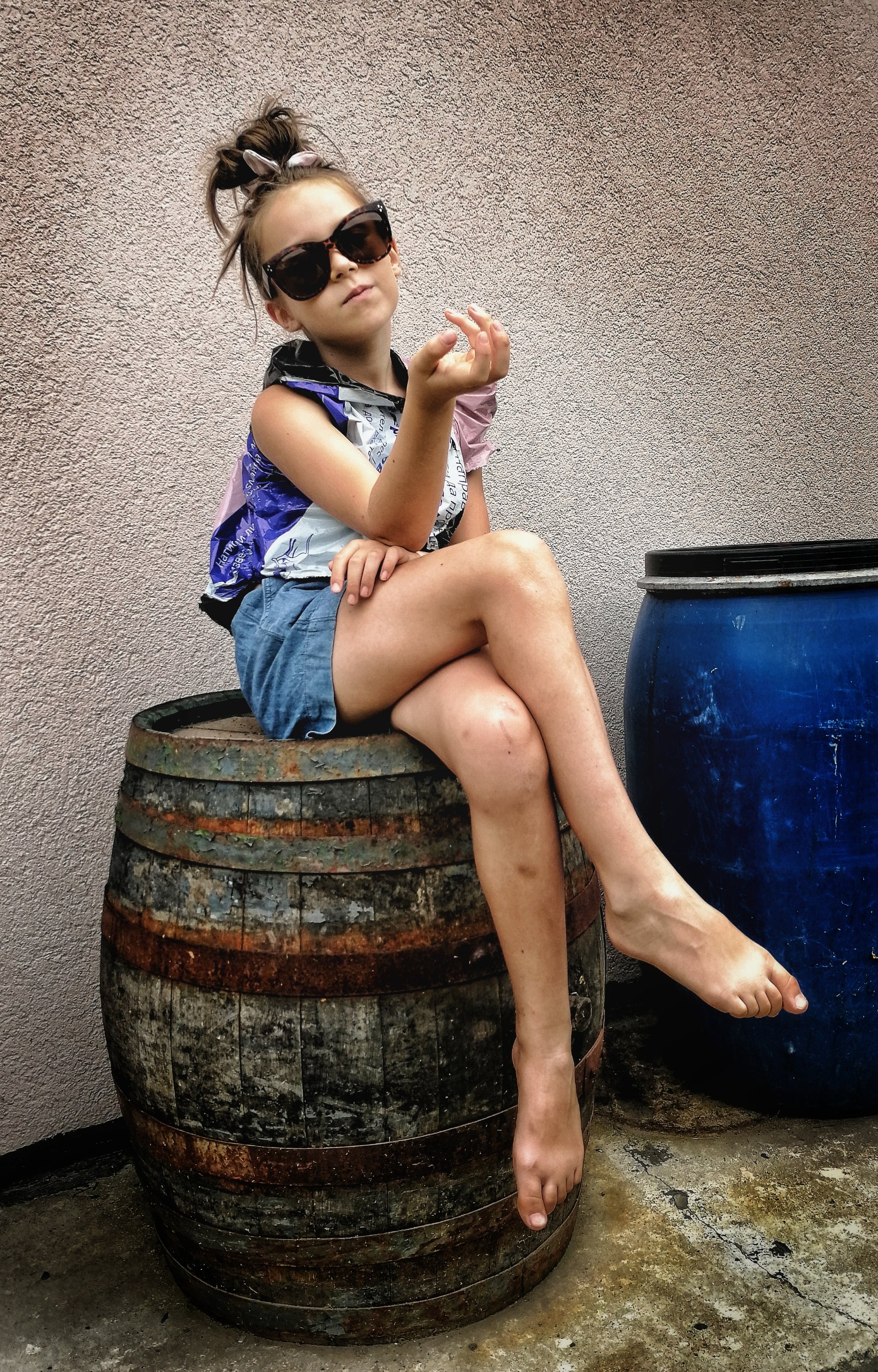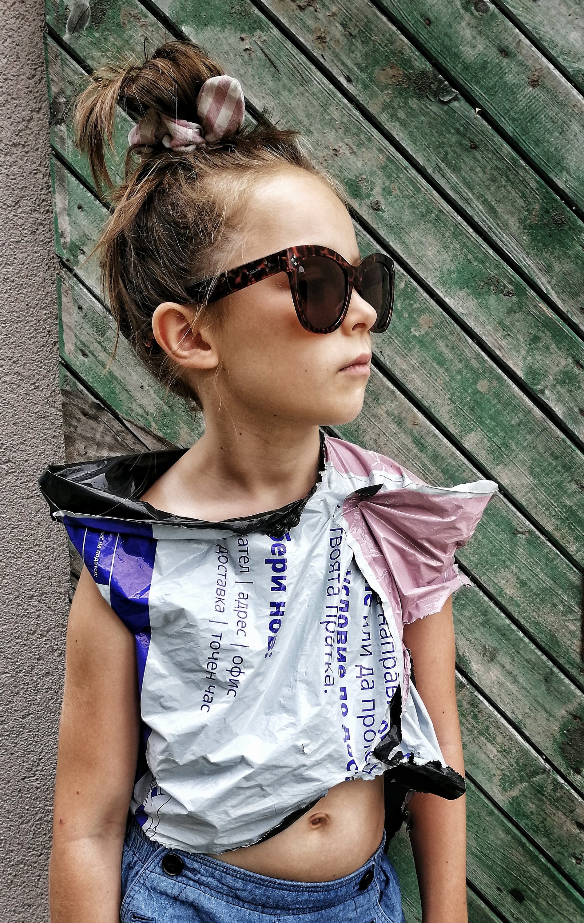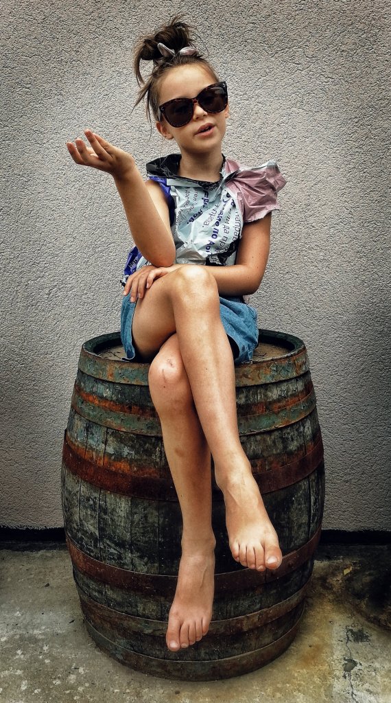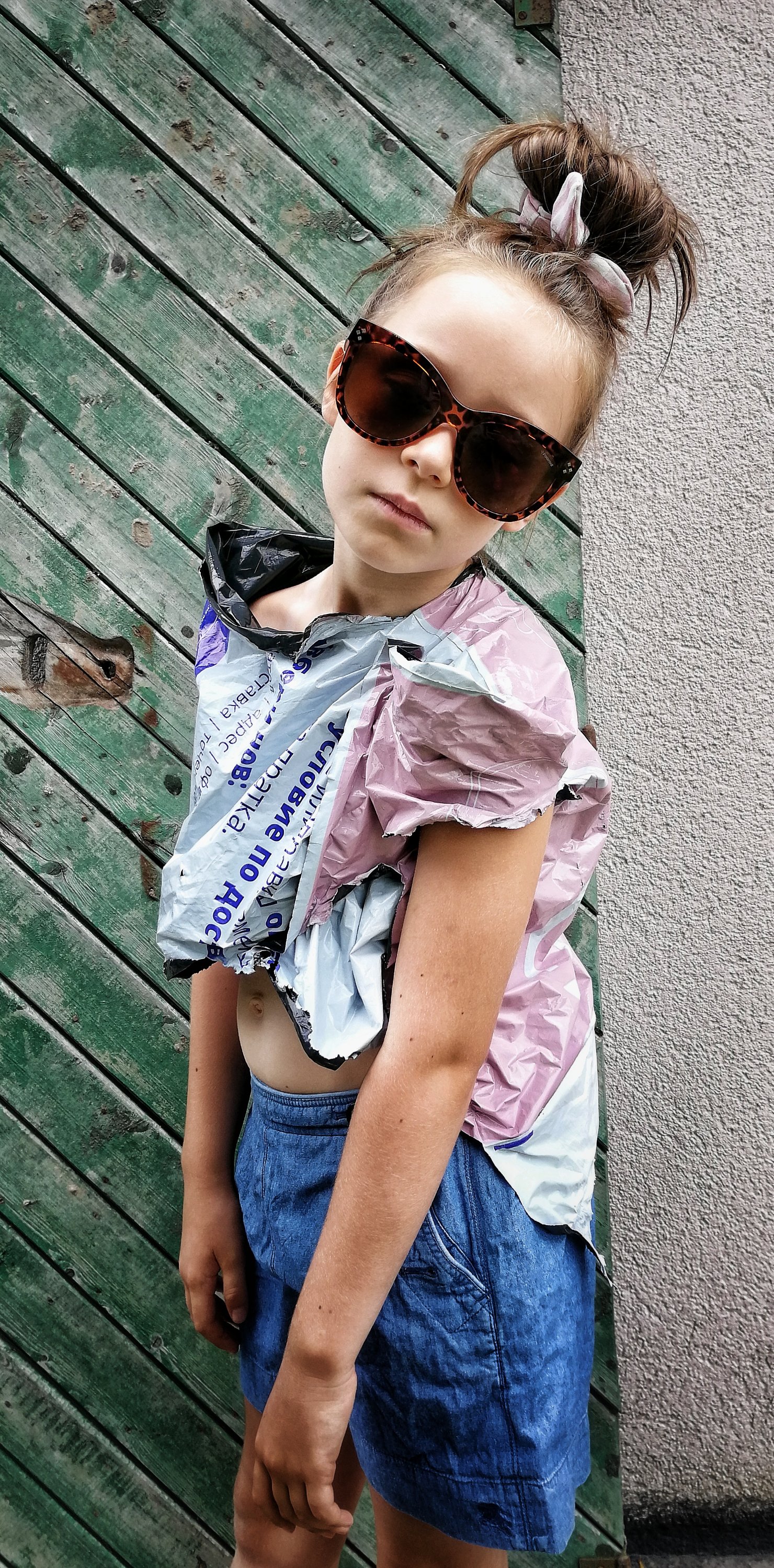 Вивата взела една кофа с вода и набор от четки и маже напред, назад… Боядисвала… След малко: Оф, мамо, никой не си играе с мен! Какво да правя? Скучно ми е!… Не знам Виве, измисли си нещо… След още малко.. Мамо, виж ме, виж какво направих…! Разцепила един плик от куриерска фирма, направила си блузка и я облякла… Ехаааа! Биба, дай да те снимам! Намерихме една стара врата отстрани на къщичката и други разни декори, мислих и с два таса от колата на татко да я снимам, ама й боцкали..