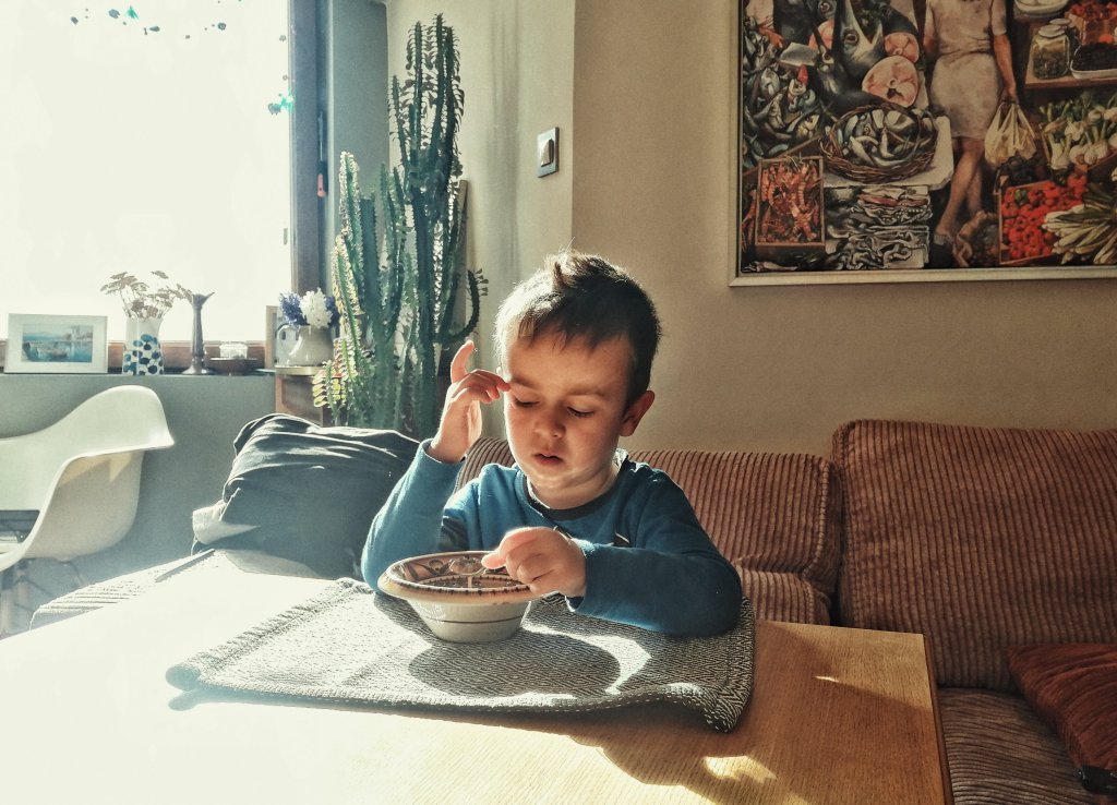 Танцувам там докато си правя кафе на плота, пея с песните на детските дето дрънчат от телевизора … Максим вдига очи и ми казва с невъзмутим сериозен тон:Мамо, спри да се лигавиш, сИга ям!