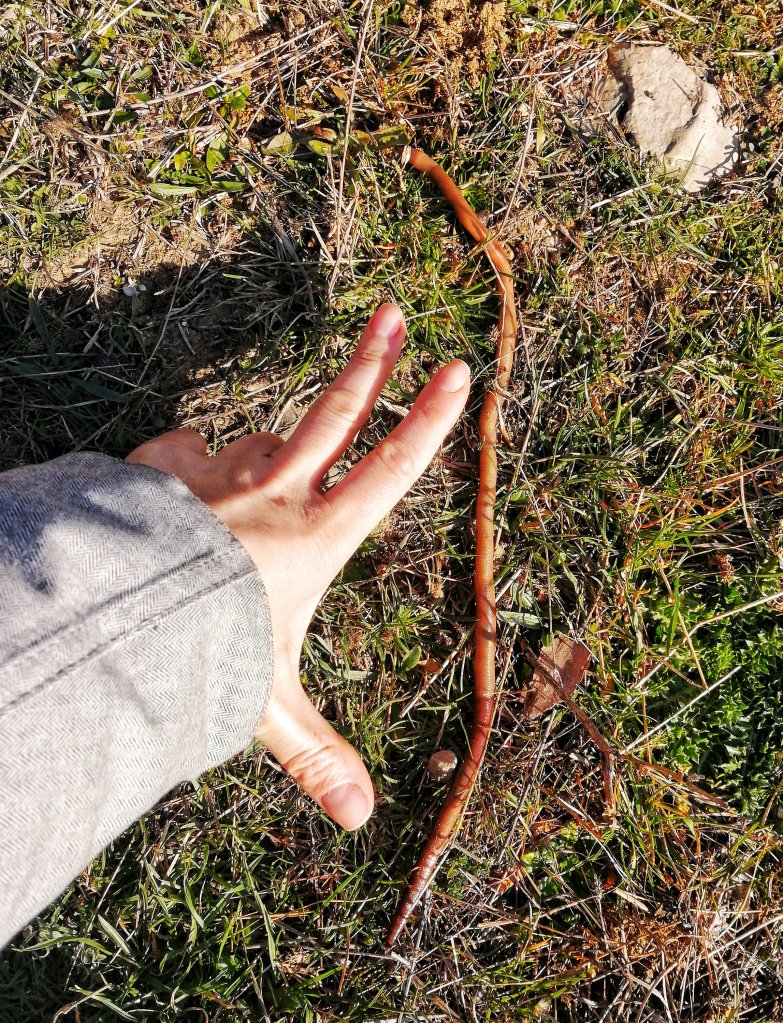 Заизкачвах хълма нагоре към гората и тръгнах по пътеките, дето са ги направили овцете, а някъде в далечината се чуват и хлопките им, птици пеят, пръчки пукат под краката ми… Радвам се на всяка тревица наоколо… Съзирам ОГРООООМЕН червей, ръчкам го с пръчка.. Жив ли си, бе? А той, поспрял за малко, продължава да се измъква от дупката си.. Вярвам отесняла му е цяла зима да стои и чака навъртян като спагета в нея, дорде пукне пролет и се сгрее земята, че да излезе от нея…