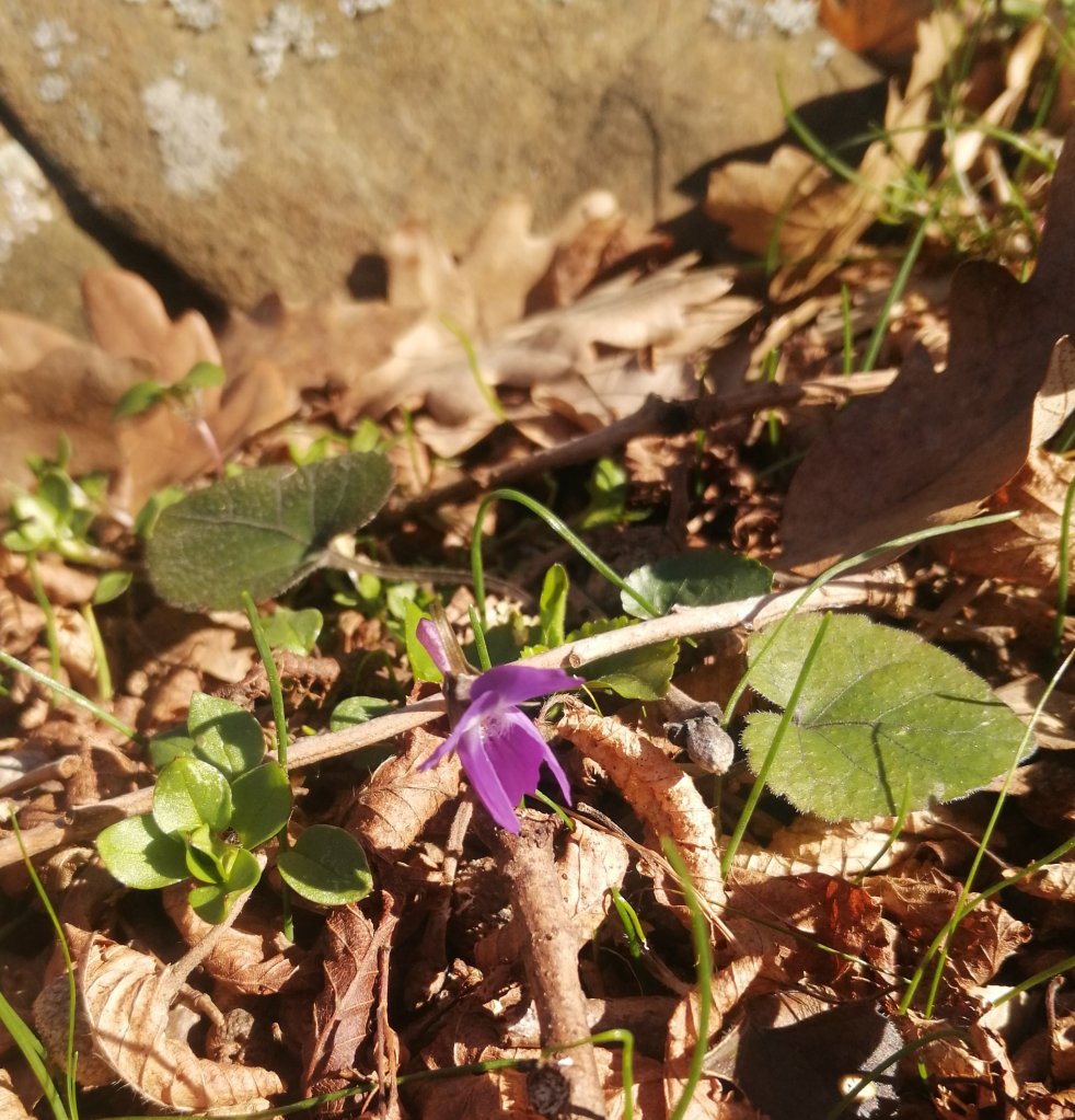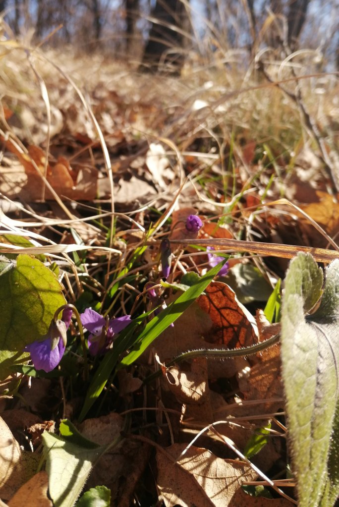 Влизам в гората, а там рязко става стръмно. Имам си едно любимо място на стеблото на един дъб, с форма на столче, покрито с мъх… И сядам тъй да си поразговаряме… Гледам наоколо прехвърчат шарени кълвачи: Ей, дайте ми едно перо от вашите!!! Но не чуват и стрелкат измежду клоните на дърветата… Продължавам по надолу и заравям краката си в дълбокия килим от листа… Минзухарите ги няма, но под листата съзирам едва подаваща се виолетка…. И ето, защо не напразно в детските стихчета и песни са я кръстили „срамежлива теменужка „