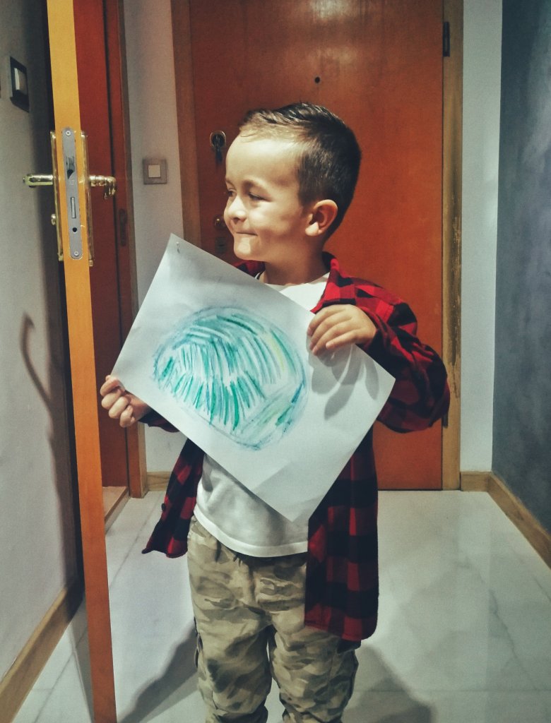 Макси, хайде маме че татко ти те чака да тръгвате…!-Чакай да нарисувам нещо..-Какво рисуваш?Нашата планета? Зная че има синьо и зелено, но ще сложа и малко жълто…И със слонско спокойствие продължава да си довършва започнатото.. Всички кротко чакат, че ако му се прекъсне занятието ще изригне😂…Един ден разказал на баба си как се е родил..-Бабо, ти знаеш ли аз как се родих?-Не, кажи ми!-С мама двамата бяхме на друга планета, там един чичко ни сложи каски и ни качи в кораб, за да дойдем на земята…С мама се качихме и тръгнахме, той остана там.. После вече бяхме тук, аз излязох от мама и отначало не я познавах, тя също… Но после… се познахме… Мама ме пита някога дали ми е разказвал тази история.. Не я бях чувала.. Попитах го и пак я разказа по този начин..Преди 5 години, явно съм била на друга планета и сме се открили, малък мой, башмачок!Честити 5💋!